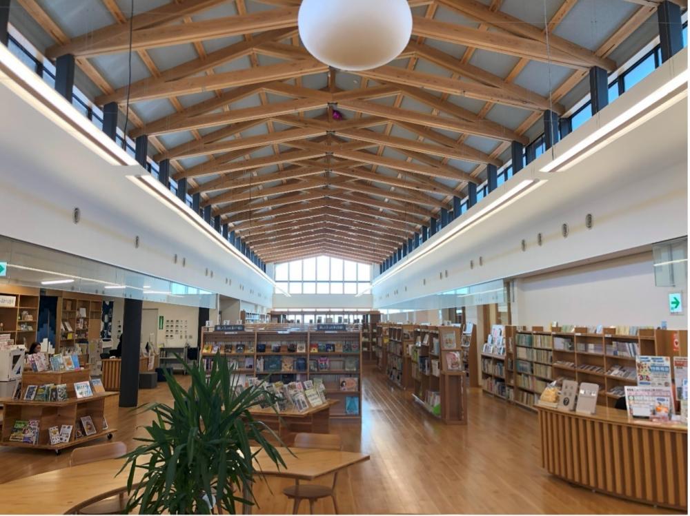 「ちえの森ちづ図書館」は、智頭町に位置し、設計は徳岡建築設計事務所で2020年に完成しました。内部は連続する木のシザートラスが見える、コンパクトで使い勝手の良さそうな図書館です。