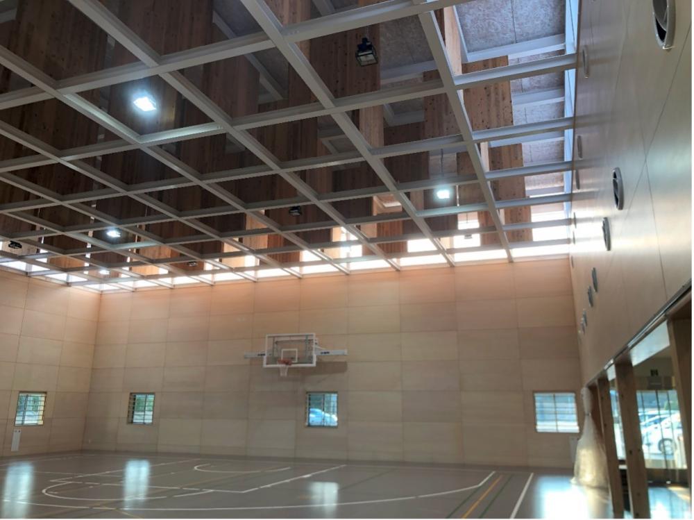 「ノバリア」は、鳥取市にある多目的スポーツ施設で、設計はプライム建築都市研究所で構造はKAP、施工は地元の掛樋工務店で2020年竣工です。外観はそれほど特長を感じませんが、中に足を踏み入れるとCLT板が空に浮遊しているような独特の空間が広がっています。訪れたのは夕方でしたが、ハイサイドライトから入り込む光も美しかったです。