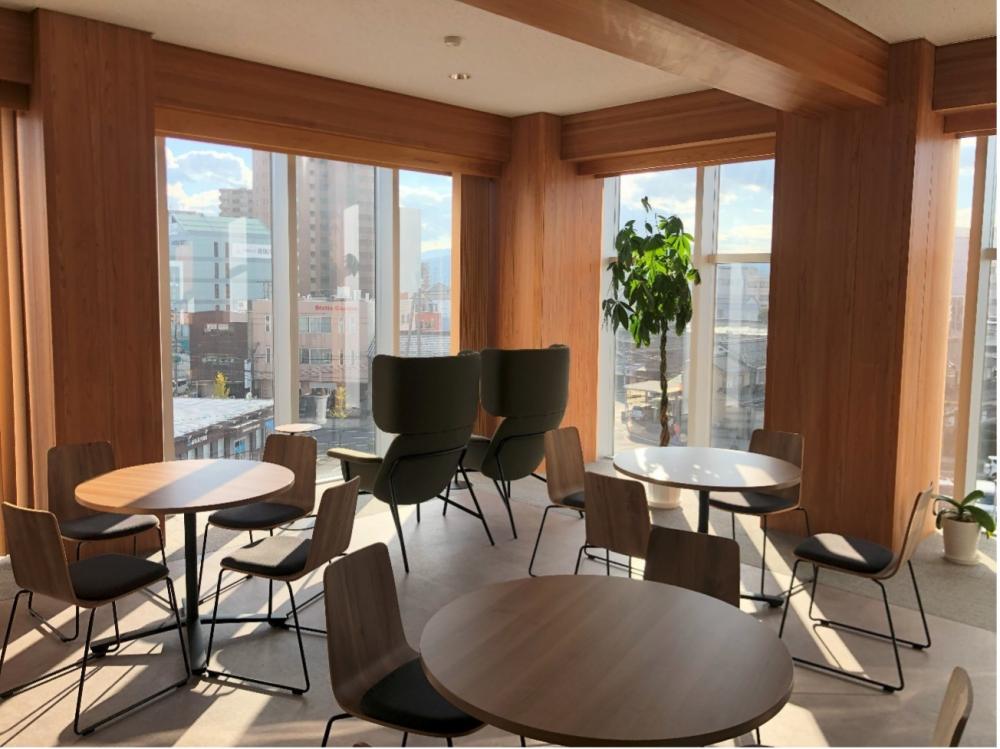 鳥取市の中心部に建つ準木造4階建てこの建物は、設計は地元の白兎設計で2020年に竣工しました。SMB建材のサミットHR工法によるラーメンフレームにCLT(Cross Laminated Timber)の屋根・床板を組み合わせています。耐火構造なので、構造フレーム、CLTなどは被覆されていますが、内装制限を緩和させることで可能な限り内装材として鳥取県産材が使用されています。
