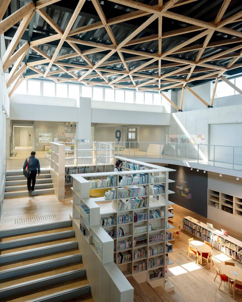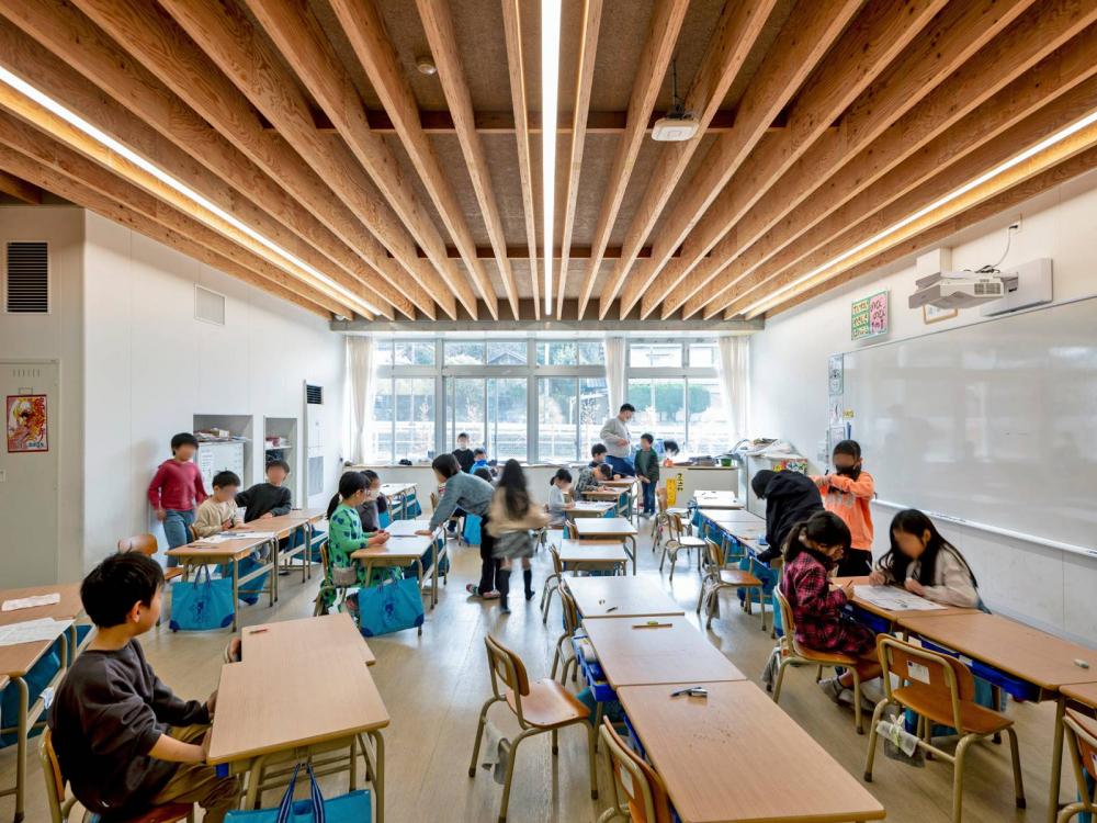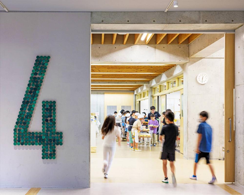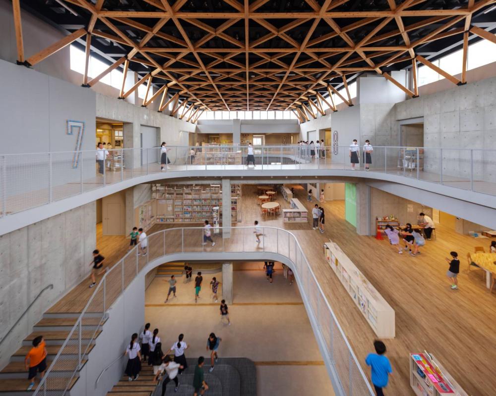 地上三階建ての学校建築である。主体構造は鉄筋コンクリート造(一部鉄骨造)であるが、空間を彩る木質化を実現する手法の一つとして、仕上も兼ねたLVLによるプレキャスト化粧型枠を採用している。これにより支保工間隔を拡げて現場の作業スペースを確保し、また、コンクリート養生後に支保工を外すと天井仕上げが完了状態となるため、工期短縮を可能にしている。また、LVLはスラブ打設後も単なる仕上げ材ではなく、スラブの変形抑制にも利用している。