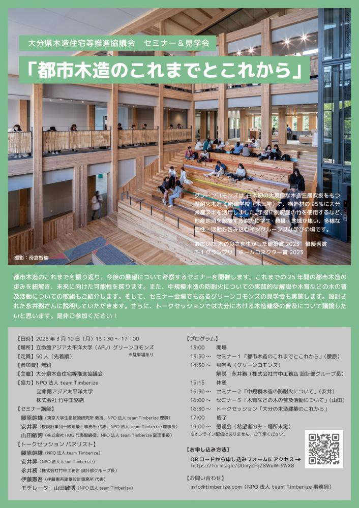 【内容】都市木造のこれまでを振り返り、今後の展望について考察するセミナーを開催します。これまでの25年間の都市木造の歩みを紐解き、未来に向けた可能性を探ります。また、中規模木造の防耐火についての実践的な解説や木育などの木の普及活動についての取組もご紹介します。また、セミナー会場でもあるグリーンコモンズの見学会も実施。設計された永井務さんにご説明していただきます。さらに、トークセッションでは大分における木造建築の普及について議論したいと思います。是非ご参加ください!