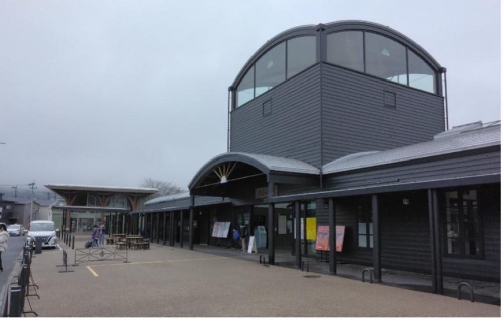 このように、建築の表現は異なるものの湾曲集成材という共通の構成要素を持った二つの建築が呼応するように並び立つことで、観光客にとっても由布院に来たことが感じられる玄関口にふさわしい顔となっています。
