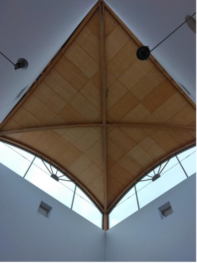 続いて訪れたのが、有機的な木材のボールトが透明感のあるヴォリュームを立ち上げている特徴的なたたずまいを見せる「由布院ツーリストインフォメーションセンター」です。4.5m間隔に設けられた十字柱は、4パーツの湾曲集成材を組み合わせたもので、上部にいくに連れて4方向に分岐してボールトを構成しています。こうして出来た特徴的な空間に1階には観光情報案内スペース、2階には「旅の図書館」の機能が差し込まれ、それらが吹抜けとスロープを介して一体的に繋がれています。建築の構成としてはシンプルながらも、木材を利用した豊かな環境が実現していました。