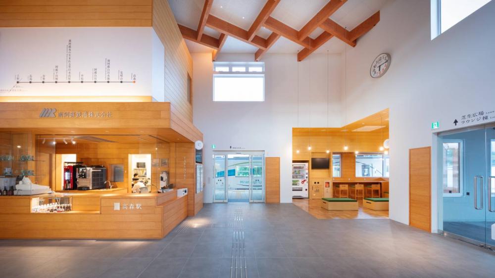 南阿蘇鉄道復興の一環として再開発された、終発着駅である高森駅舎と交流施設である。