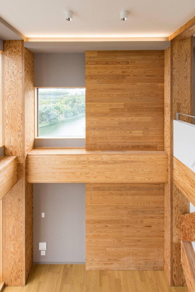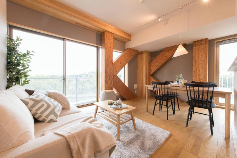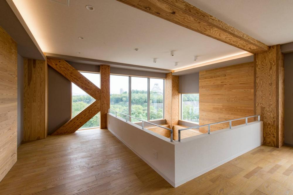 上階の木造部分は軸組工法となっており、柱・梁には国産カラマツ材のLVLが用いられている。耐震要素としては、下層のより耐力が必要な部分ついてはカラマツLVLの耐震ブレース、上層で構造的負担の少ない箇所にはスギCLTの耐震壁がそれぞれ用いられ、さらには7~8階のオーナー住戸の一部には1時間耐火性能を持った難燃薬剤処理LVLも用いられており、まさに都市木造に必要なLVLによる様々な技術が適材適所に組み込まれている。