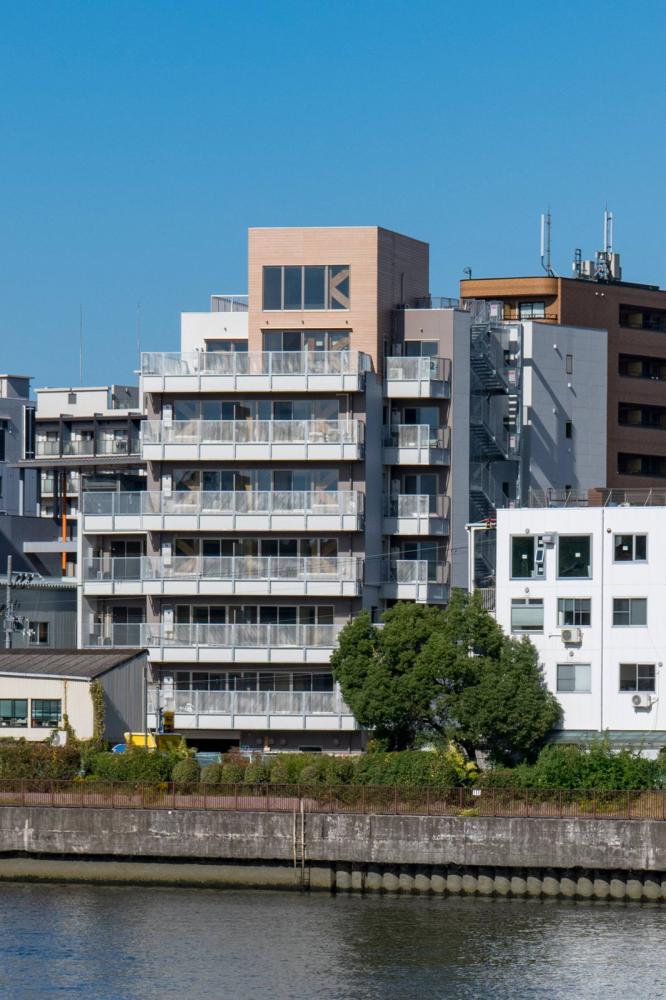 1~3 階を鉄骨造、4~8 階を木造の立面混構造として計画された共同住宅・オフィス・店舗から構成される高層木造建築である。